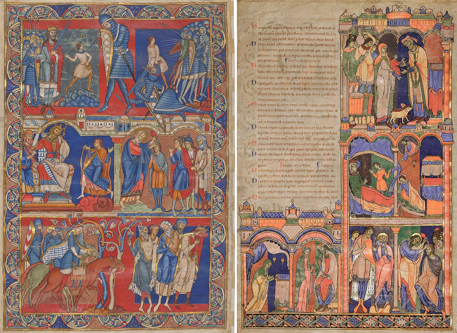 At least six of them working over a period of twenty-five years. None of them signed their work and we do not know their names. In the 1940s, an art historian named Walter Oakeshott studied the Bible systematically, and for the first time gave the artists names based on what he could see in their work: the Master of the Leaping Figures, the Master of the Apocrypha Drawings, the Master of the Genesis Initial, the Amalekite Master, the Master of the Morgan Leaf, the Master of the Gothic Majesty.