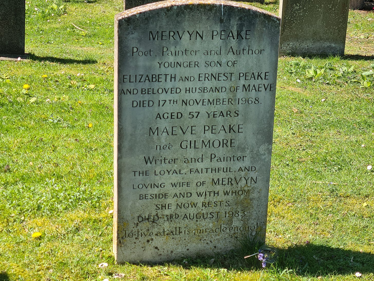 The writer is Mervyn Peake. Not only was he a writer, he was also a poet and artist. His grave is in St Mary the Virgin churchyard in Burpham, an eleventh-century church in a village that is so quiet and tucked away that you could miss it entirely. Also in the grave is his wife Maeve Peake. She died in 1983.