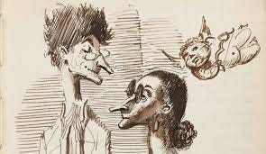 It begins, for our purposes, with William Hogarth. His eighteenth-century engravings are savage, comic, overpopulated and merciless. Every face is exaggerated, distorted. Every exaggeration tells a truth. Hogarth does not caricature for laughs alone. He caricatures because the distortion reveals something the polite portrait would conceal. The drunk, the vain, the corrupt, the desperate – Hogarth draws them all as though the outside of a person should be forced to confess what is happening on the inside.
